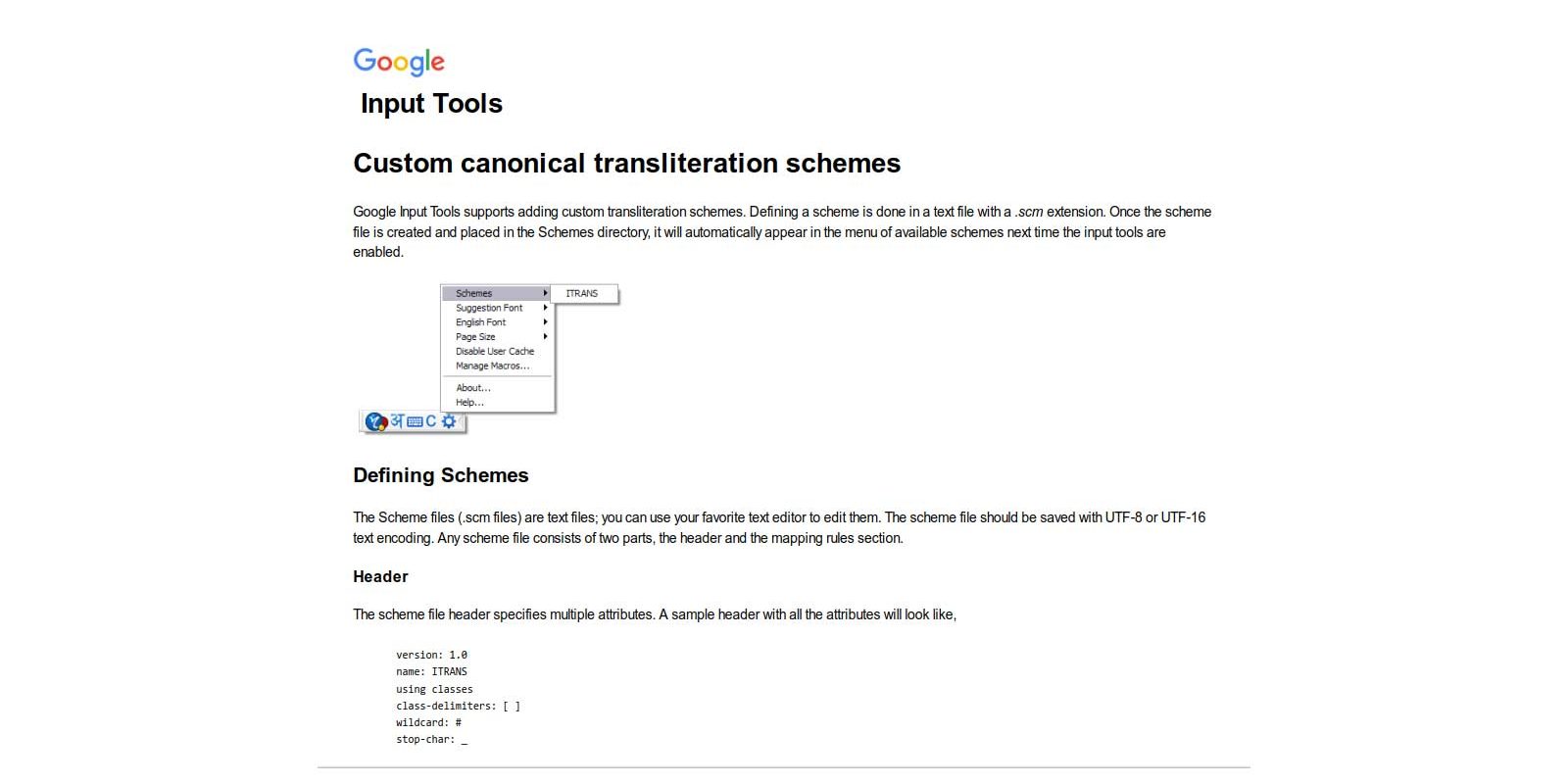 यहाँ जो ‘C’ दिखाई देता है यह उसी स्कीम को चुनने का टॉगल आप्शन है। टाइप करते समय यदि आप गूगल के डिफ़ॉल्ट मोड में हैं तो इस ‘C’ बटन पर क्लिक कर के दो मोड के मध्य स्विच कर सकते हैं। इसका शोर्टकट की है Ctrl+M. आप एकाधिक स्कीम बना कर रख सकते हैं अत: एक से अधिक स्कीम में से चुनने के लिए गियर आइकॉन पर क्लिक करें और वंचित स्कीम चुने। उदहारण के लिए ITRANS जो गूगल इनपुट के साथ बाय डिफ़ॉल्ट आती है।